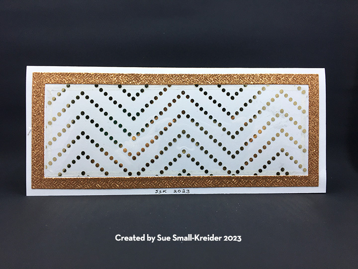 Cardbase: I used a medium weight white cardstock rectangle measuring 8 3/4 x 7 3/4-inches. When folded in half, the card measures 3 3/8 x 8 3/4-inches. Using the largest two dies from the Long Rectangles – Crosshatch die set, I cut frames from gold glitter cardstock and a large white rectangle to cover the front of the card. The frames went on the front and back of the card. For the inside of the card, I followed the dimensions of the largest die, but used a paper cutter to cut two panels of gold dotted acetate. (The acetate was too thick for the die to cut well.) While the glitter cardstock and white cardstock could be adhered using glue, the acetate required double sided-tape. Measuring the inside of the glitter frame on the back of the card, I cut a piece of acetate to fit the opening.