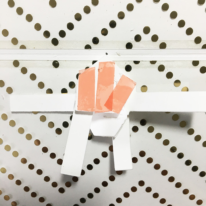 Before I began, I read through Nicky’s blog on her card and watched Karen Burniston’s video on making a triple heart collage slimline pop-up card. I learned that I would need to trim down the outer mechanisms’ arms that will stick out of the card and continually test the placement of items to avoid catch points. The mechanism I used is the from the Heart Collage Pop-Up die set.