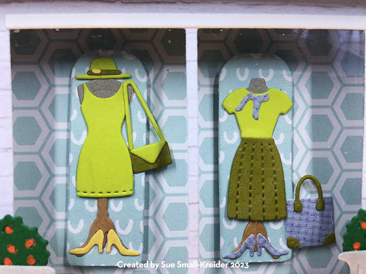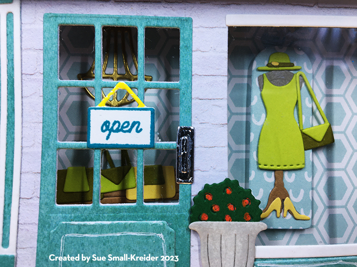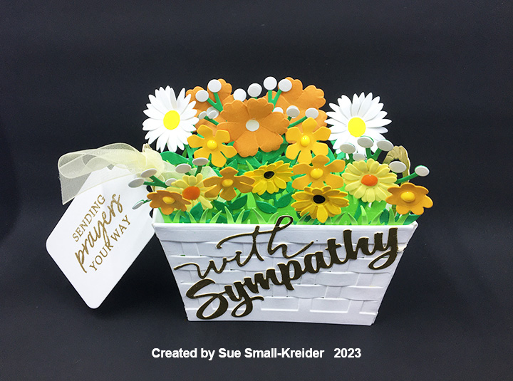 I use the following Karen Burniston dies Woven Basket Box Card, Wide Woven Box Card, tag from Tag Book Pop-Up, flowers from the Flowers and Bee and Flower Pot Pop-Up, and With Sympathy sentiment. I also tried the new Small Scenes Bam Box to pop-out the basket when pulled from the envelope. Nuvo Drops were used to make the small flowers’ centers.