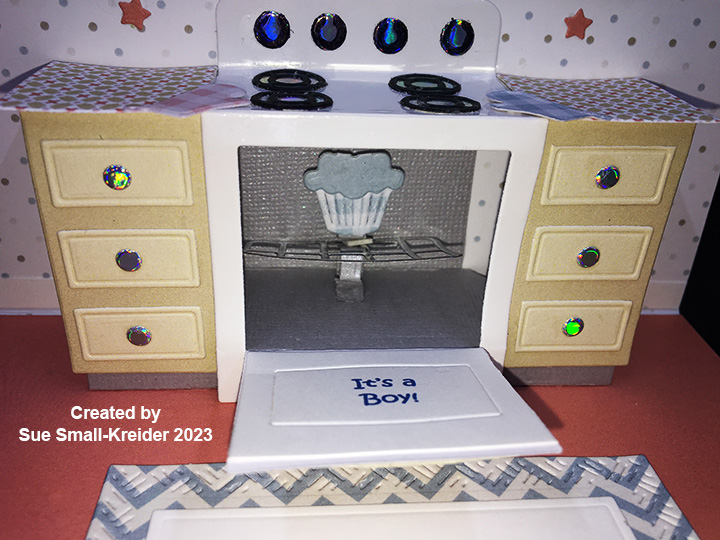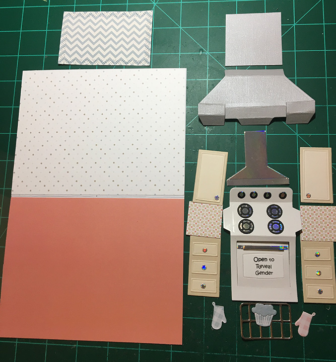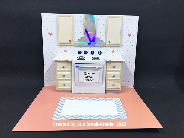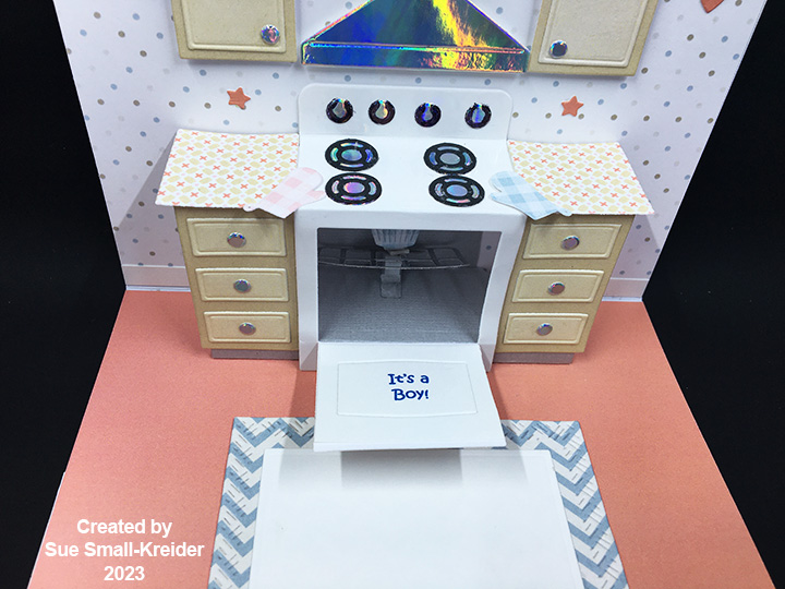 Side Tables: Once the stove is attached, you can add the side tables which are made with the cabinet and drawer dies from the Oven Pop-Up. Cut a narrow rectangle in the middle of the long section of the cabinet piece to create the legs. attach to the stove and platform as normal. Pink ink was lightly sponged onto the tabletops and drawers.