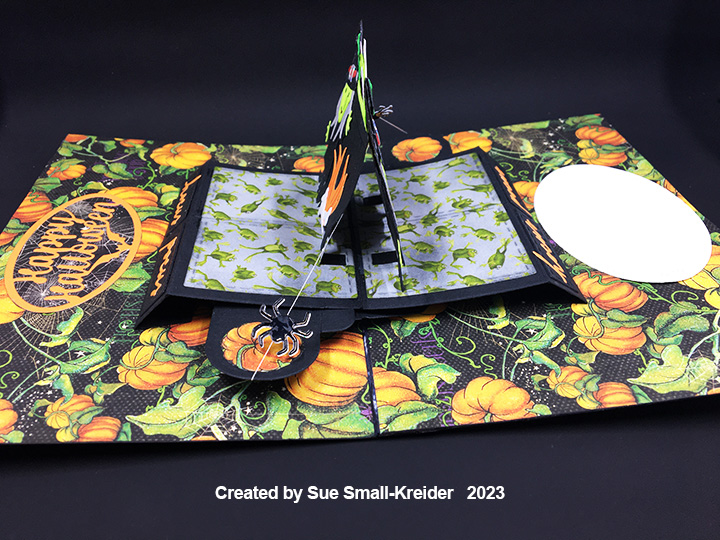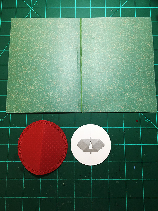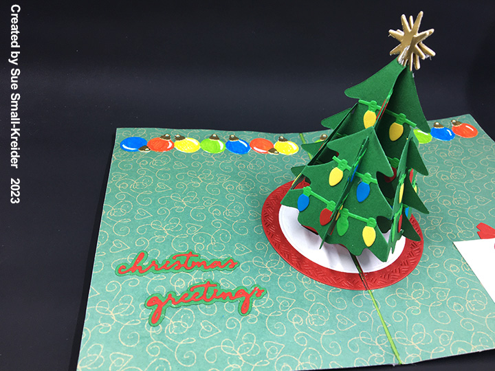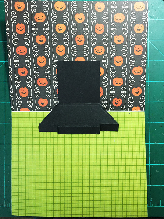 Mark with a pencil the center point of the card fold. Center the double platform and attach the back tabs with glue. Fold the platform and front tabs as shown in the photo and add glue to tabs, close card to attach the platform to floor of card.