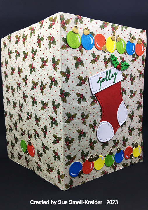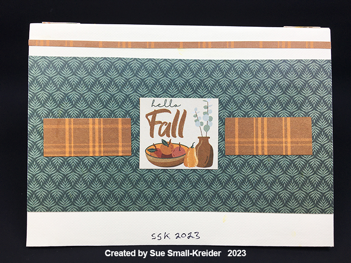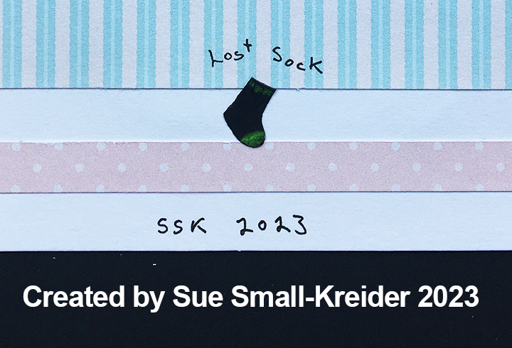 Cardbase: I used a purchased A7 cardbase. Each of the inside panels are covered with papers from the Cosy Kitchen paper collection. The front of the card has a computer-generated panel while the card back uses scraps from the inside of the card including the lost sock.