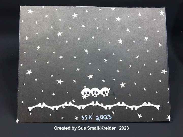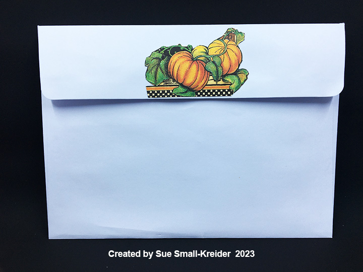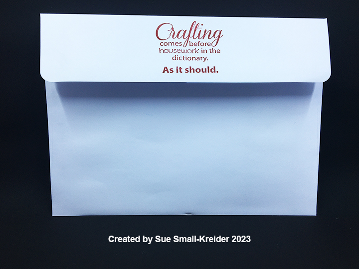Envelope: To hint at what’s inside, the sentiment stamp of “Crafting comes before housework in the dictionary. As it should” is stamped in red on the back flap.
