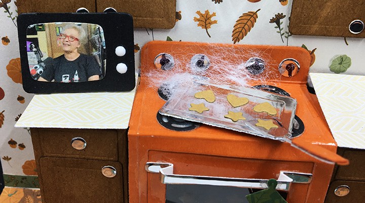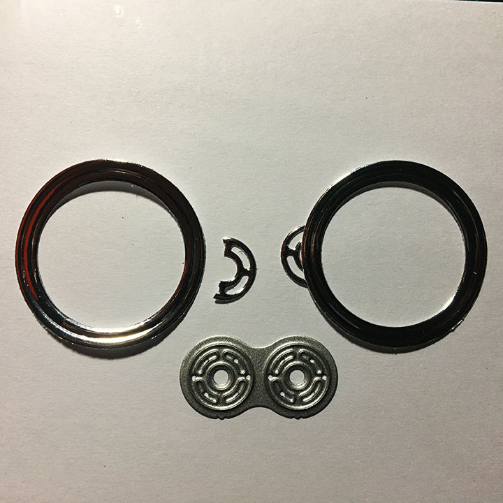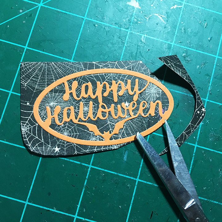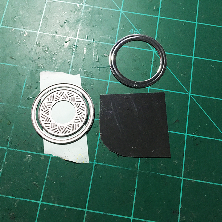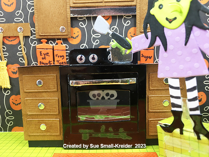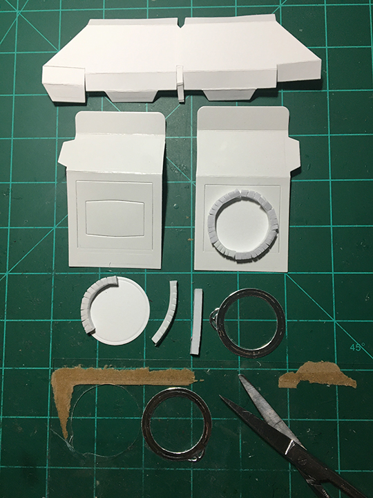 Cut two circle frames by using the smallest circle dies in the Circles – Crosshatch set from silver foil cardstock. Cut one of the stove burners from the Oven Pop-Up set and cut it in half for the clasp on the washer/dryer doors.