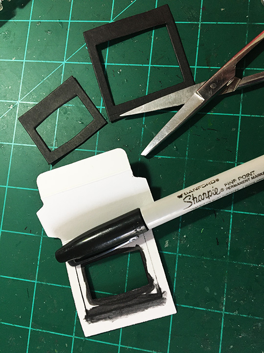 TV: The TV set from the Memory Charms die set has had its antenna and feet trimmed off and Nuvo Drops added for knobs. I screen shot a photo from the Craft Roulette episode #182 and resized it to a 1-inch rectangle, print on white paper and die-cut it with the TV screen die.