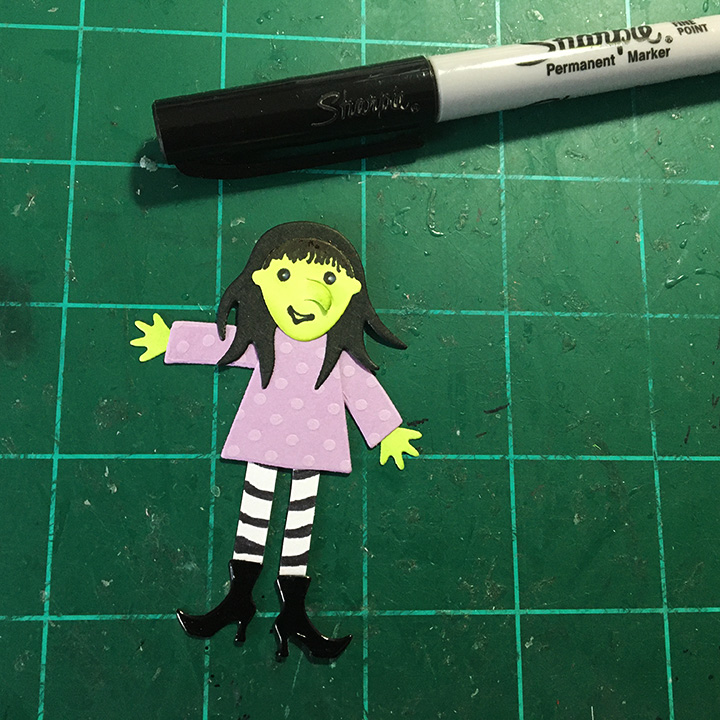 Cut two stove pieces from glossy white cardstock. Trim off one of the side tabs from each piece as shown in photo. Tape the oven door and window piece in place using packing tape on the backside. Glue the silver doors with clasps onto clear plastic and cut them out. (I used a piece plastic that had been a window in packaging.) Take foam strips and snip along one edge to make them bend easily. Place the snipped foam strips around the edge of two white circles (cut using the larger of the silver frame dies.) Cut socks from the gnome boots in the Gnome and Santa set. Use gel pens to add details to the socks. Glue four socks to the back of each white circle. Add circle confetti to washer shaker and a single black sock to dryer shaker. Glue the silver framed doors to the shaker circles.