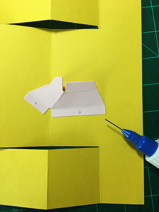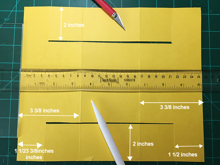 Cardbase: I started with an 8.5×10 inch piece of heavy yellow cardstock. Using a pencil and a T-ruler to mark where horizontal slots need to be cut as well as vertical scoring for the various folds. See photo for measurements. Measure the various sections and cut decorative paper 1/4 inch smaller than the measurement for each section. Glue in place before moving onto the mechanism. (I forgot and had to remove and then re-glue the mechanism.)