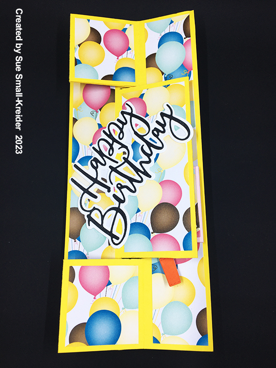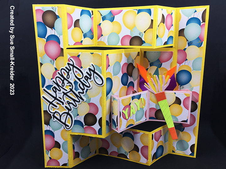 I made this card for a family member whose birthday is in September using a fancy fold display template that I had seen in a Die-cutting Essentials magazine a few years ago. I modified the template for an 8.5×11 inch piece of cardstock and to allow for the Karen Burniston Stocking Pop-Up mechanism that I wanted to use in it.