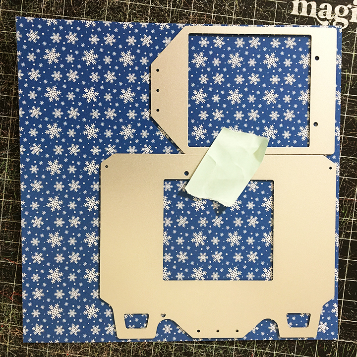 The box is cut in one piece. (I was able to cut it from an A5 (5.83 x 8.27 inches/14.8 x 21 cm) piece of blue water patterned paper.) Before assembling, cut out the window with the largest of the square dies in the set and back it with a scrap of clear acetate or plastic packaging. Then, adhere the cut-out inside the box as a backdrop for the window.