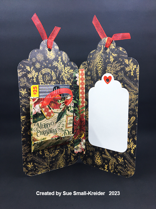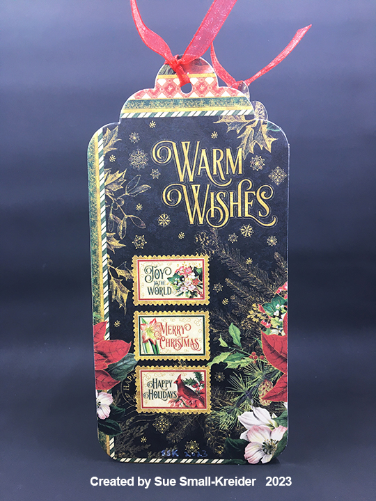 Sentiments: The main sentiments of βMerry & Bright,β βMerry Christmas,β and βWarm Wishesβ are all on the decorative cardstock. The white tag label inside for a personal message is cut from smallest tag in the tag set and uses the heart hole protector also in the set.
