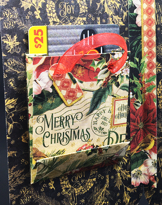 Decorations: When using patterned paper collections that have journaling cards and other cut-out decorative elements, I use them to decorate. From the Topper Tags set I used the flower hole protectors both inside and out. The foiled holly leaves and berries comes from the Holly Pattern Plate trimmed regrouped.