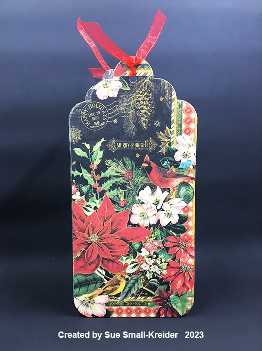 Cardbase: Cut two of the largest tags from the Topper Tags set from decorative paper that you want for your card outside. Repeat with another paper for the card inside. (Note: I had to piece one of my card fronts because I was shy about an inch with the red paper.) Cut a strip of decorative outside paper 1/2-inch by 2-inches, fold lengthwise in half and glue inside the front card tags to form a hinge. Glue the inside pieces over the hinge and match-up the tag edges.