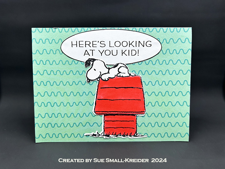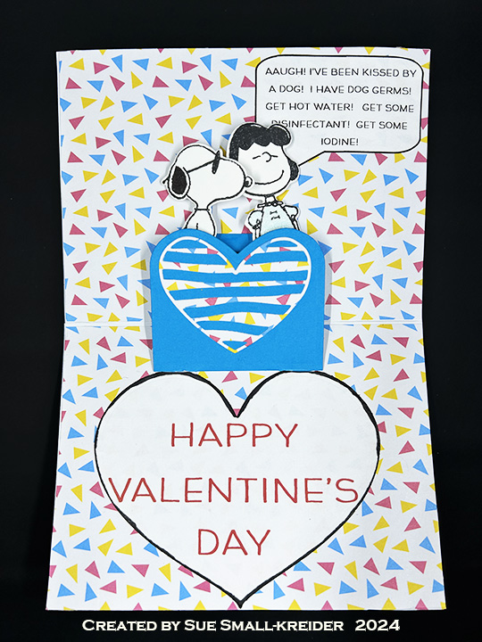 Snoopy has such a cute button nose and the papers have some icy blues. Because a kid’s card needs some interactivity, I used a wiper mechanism by i-crafter to make Snoopy smooch Lucy. The sentiments are all computer generated.
