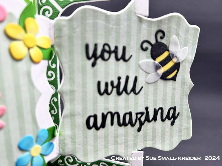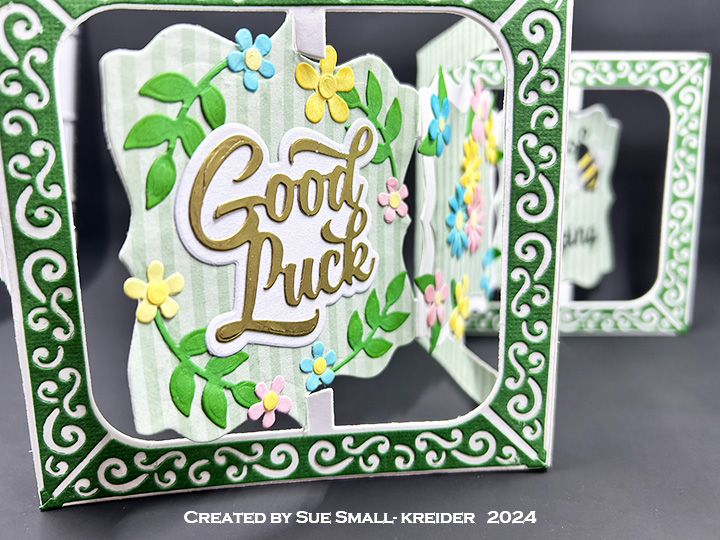 This card uses two of the new word sets in Karen Burniston’s February 2024 release – Good Luck and Word Set 18 – Connectors – along with previously released dies of Fancy Label Accordion, Fancy Flourish Frames, Flutter Charms and Fun Flowers.