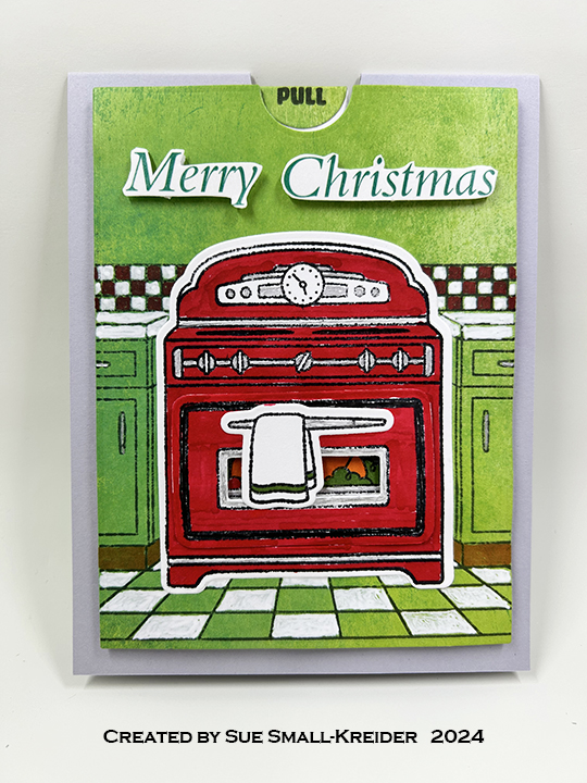 Sentiments: Outside I used “Sweet” stamped on a green scrap strip. Inside the oven I used “Christmas Wishes” both from the Lawn Fawn Sprinkled With Joy stamp set. Inside the card I used a stamp from Scrapbook and Cards Today’s Jolly Holiday workshop kit.
