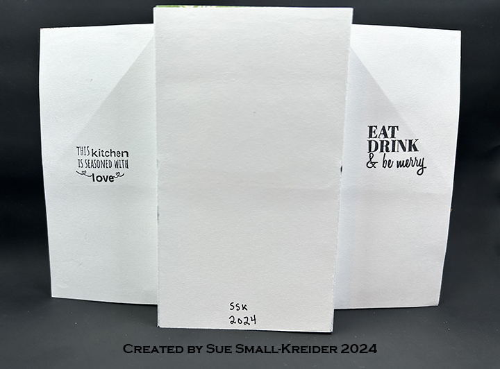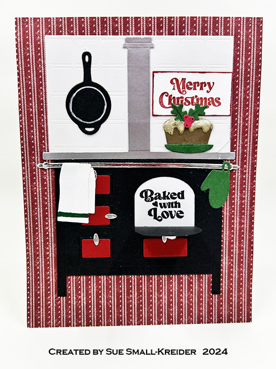 Sentiments: I used sentiment stamps from three sets. On the back of the card – “This kitchen is seasoned with love” and “Eat, Drink & be merry” are from Paper Discovery’s Simply Food set. Heat embossed in white behind the oven doors are “Merry Christmas” and “Baked with Love” from the Greetery’s Bake Someone Happy set. Also behind an oven door is “Warm Wishes” from the My Hero Monthly kitchen kit. The “NOEL” banner is a shape die set by Scrapbook.com.