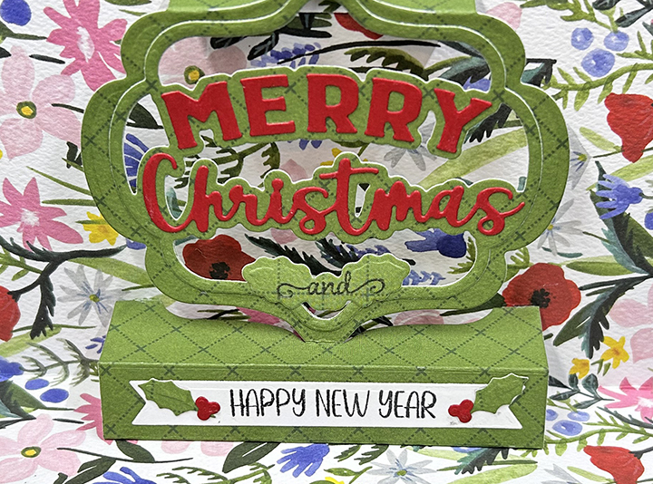 SENTIMENTS: The Merry Christmas Lorna Add-On set has a holly leaves shadow die that is just the right size to stamp the word “and” onto and glue to the bottom tip of the Lorna Label frame. The “and” and “Happy New Year” are from the Season of Cheer stamp set. The fishtail banner is a die in the Lorna Label Pop-Up set. The holly leaves and berries are in the Merry Christmas Lorna Add-On set.