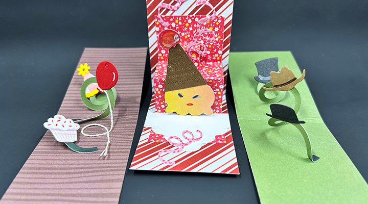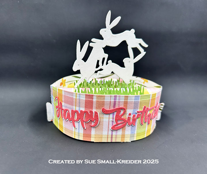 Oval Pop-Up Stand: Cut the main die in the Box Pops-Oval Base twice from heavy patterned cardstock. Follow assembly directions in video. Glue two grass strips to each pop-up strip to form a “T” shape. Place a pop-up strip into slot in oval base and fold tab where it meets the base bottom. Glue in in place. (I added a 1×4.5-inch strip of white to the back for a personal message.)