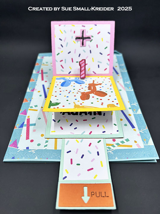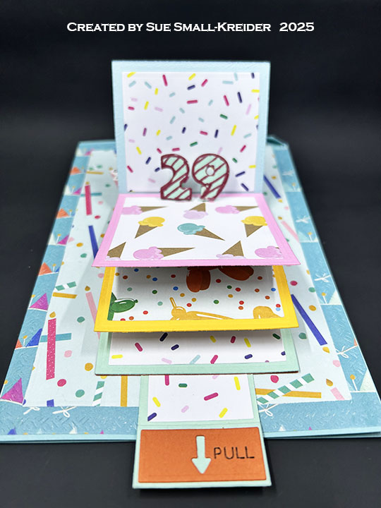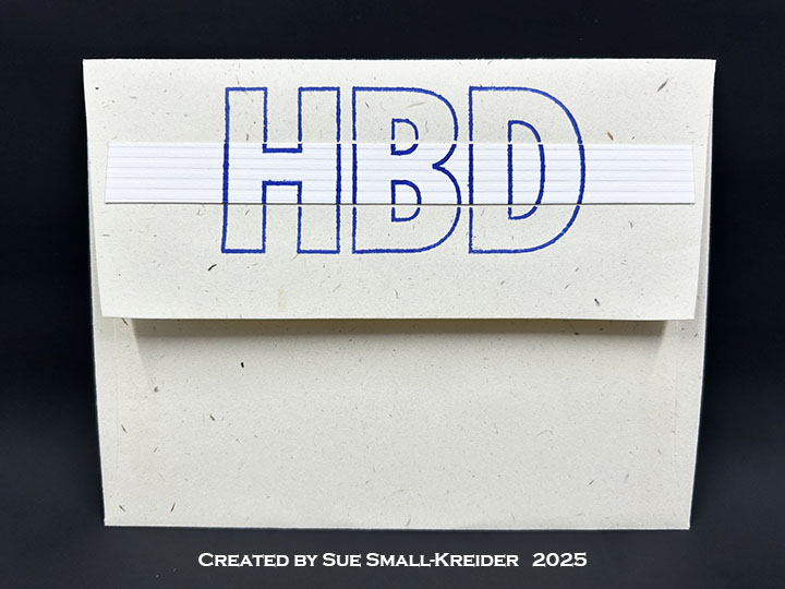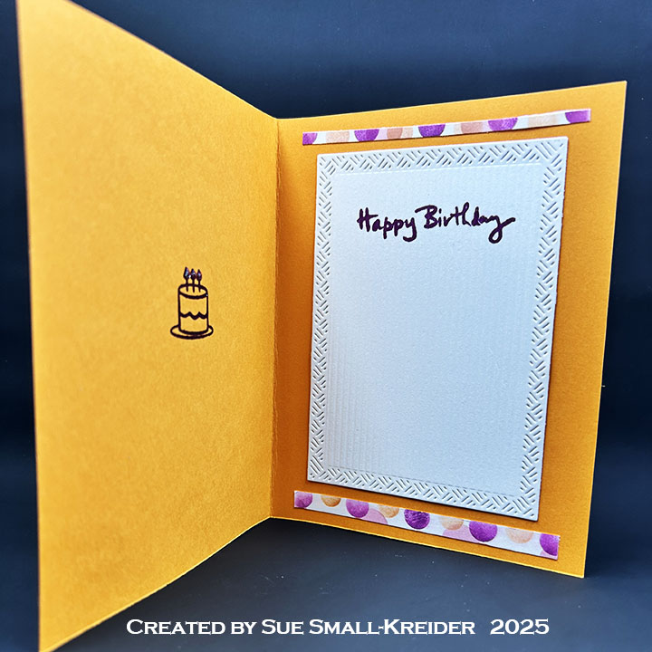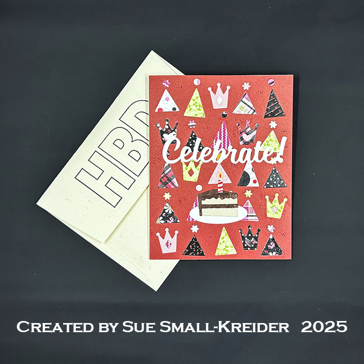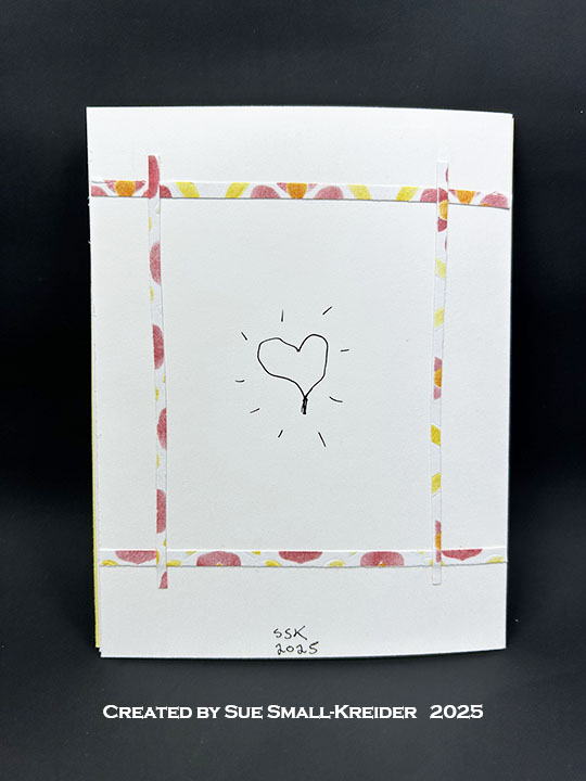 Cardbase: Start with a purchased side-fold A7 (7×5-inch) card. Cover the front with two strips of the narrow decorative papers and one 3.5×7-inches of the wallpaper print. Use scrapes to created the tab strips at right top and bottom. (I printed one set out and realized my yellow ink cartridge was empty, so the card back uses that paper. The front of card uses the set printed with all the full color cartridges.)