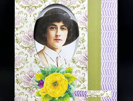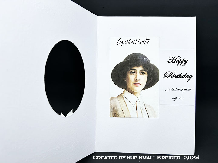 Oval Opening: I centered my 3.125-inch oval die over the cut out rectangle of Agatha Christie positioned them where I wanted them to go on the card front and carefully taped the die down while removing the picture. With the card open, I cut the oval through just the card front. Glue the picture to the inside of the card centering it through the oval window.