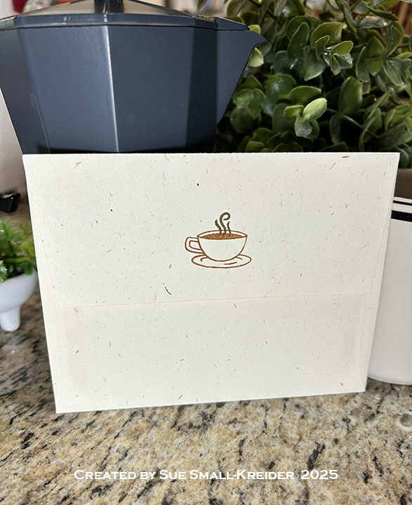 Envelope: The card fits into an A7 (7×5-inch) size envelope with a fussy cut tag from the papers glued to the back flap.