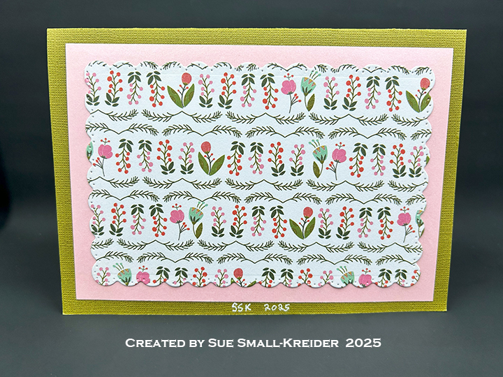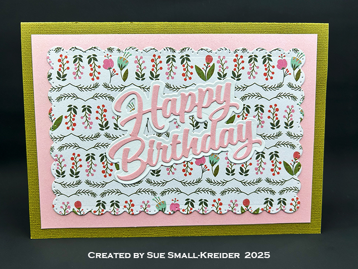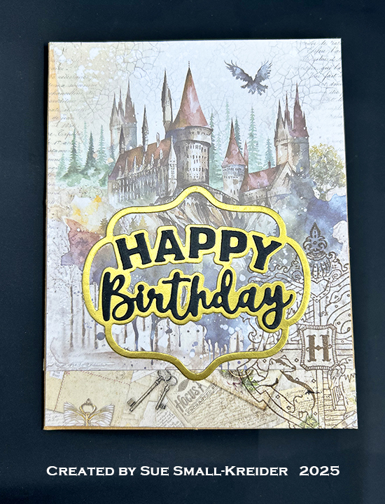 This card was made for CRAFT ROULETTE #286 whose parameters included a dude’s card, sunflower field colors, bird(s) element, and soot. Today’s card uses Spellbinders’ dies and embossing folder and Karen Burniston dies and stamps.