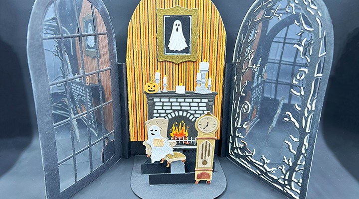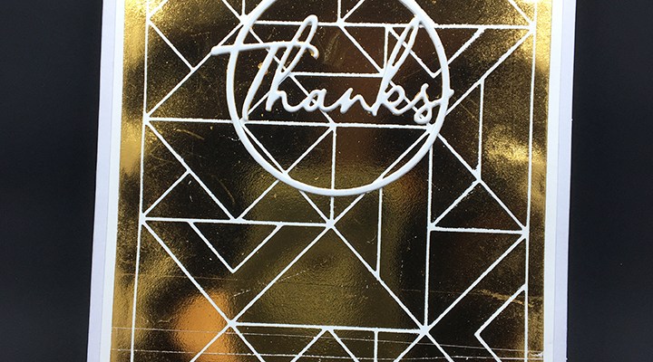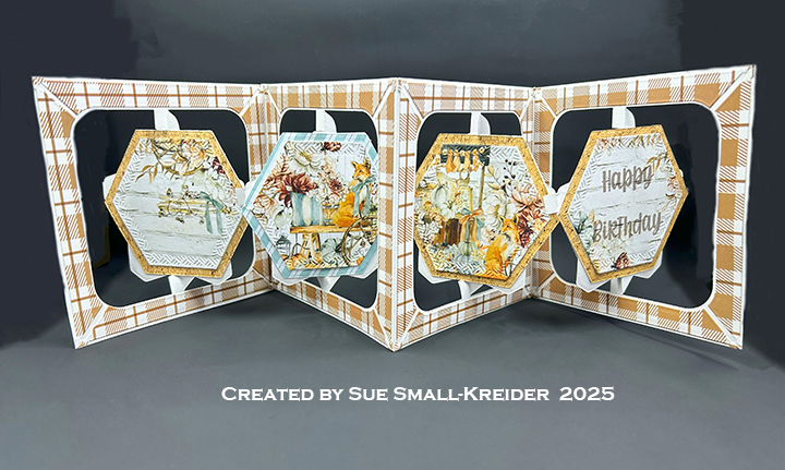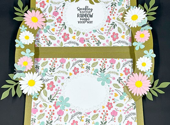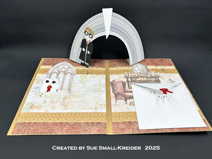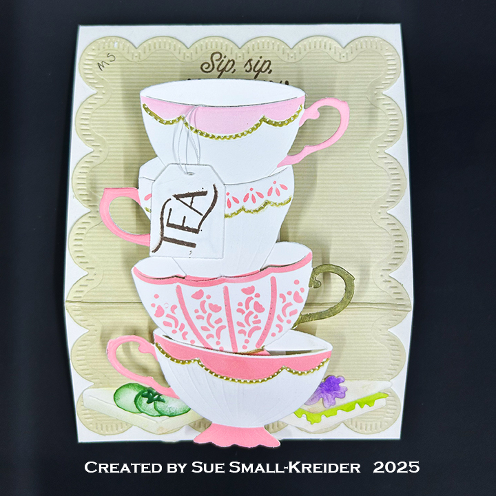 Pop-Up Mechanism: Cut one of the L-shaped mechanisms from blue cardstock using the Karen Burniston Katherine Label Pop-Up die set. (Watch the assembly video at the bottom of the linked page for the die set.) Attach inside the card as shown in the video above.