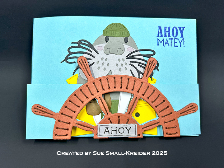 Card Assembly: Glue the strip with the ships wheel to the lower right side of one of the 3.5×5-inch rope embossed rectangles. Glue the 3.5×5-inch rectangle with the walrus glued to it on the left side of the rope embossed rectangle. Glue the remaining rope embossed rectangle to the back of the card to cover the card flap tabs.