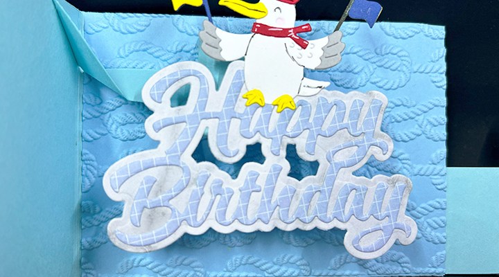 Sentiments: Using the Karen Burniston “Happy Birthday” and its Shadow dies, cut the inside sentiment and glue together. Adhere the seagull to the top of the words. Glue entire piece onto the pop-up mechanism, checking that it is hidden inside the card and does not become a catchpoint for the mechanism. Stamp “Ahoy Matey!”to the card front using Karen Burniston’s Pirate Sentiments stamp set.