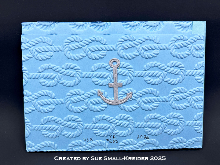 Cardbase: Cut from blue cardstock one 1.5×5.5-inch strip and one 3.5×5.5-inch rectangle. Score and fold .5-inch from the edge on both pieces to form 1.5×5-inch strip and 3.5 x5-inch rectangle. From an 8×6 sheet of heavy blue cardstock spritz with water and use the Spellbinder’s 3D Nautical Knots embossing folder to emboss the piece. Let piece dry flat. Trim down to two pieces that are 3.5×5-inches. (I made the mistake of cutting my cardstock to finished size I wanted before I embossed, forgetting that the embossing would consume some of my cardstock. So it is better to emboss a piece bigger than what you need and then trim down.)