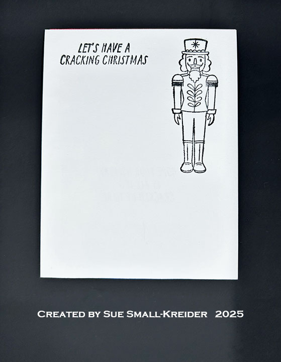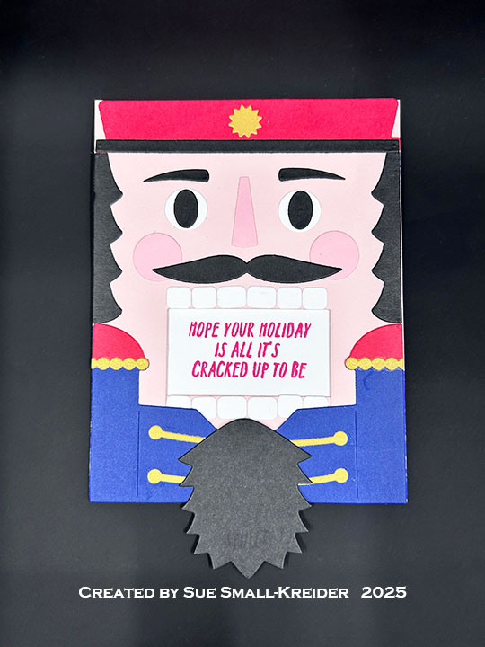 Sentiments: Stamped sentiments are from the Stamp & Cut A Little Nuts set. Inside the mouth is “Hope your holiday is all it’s cracked up to be.” On the card back is a nutcracker and “Let’s have a cracking Christmas.”