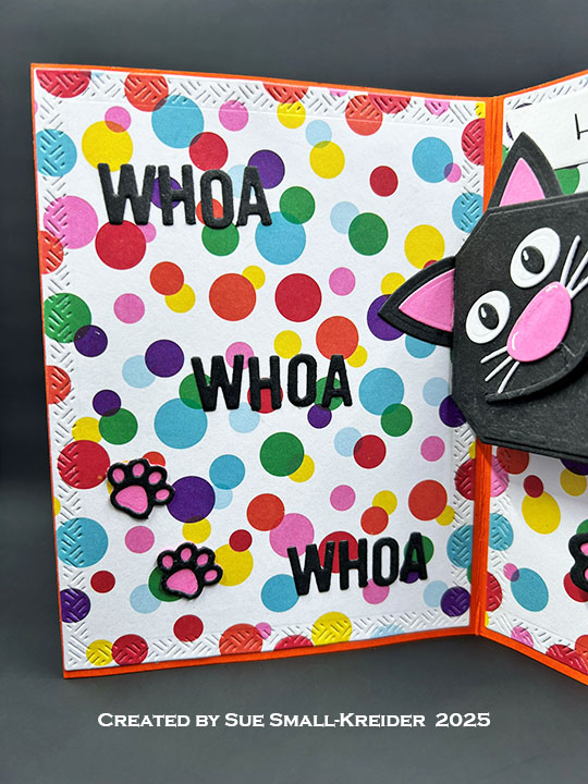 Slider Mechanism: Cut three of the large mechanism from the Big Mouth Slider die set from light-to-medium weight cardstock. Cut one “T” interactive sliding piece from pink. Using the upside-down “U” die cut out an opening as shown in the video above from the center bottom pink panel.