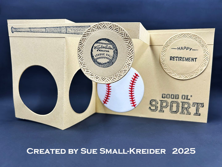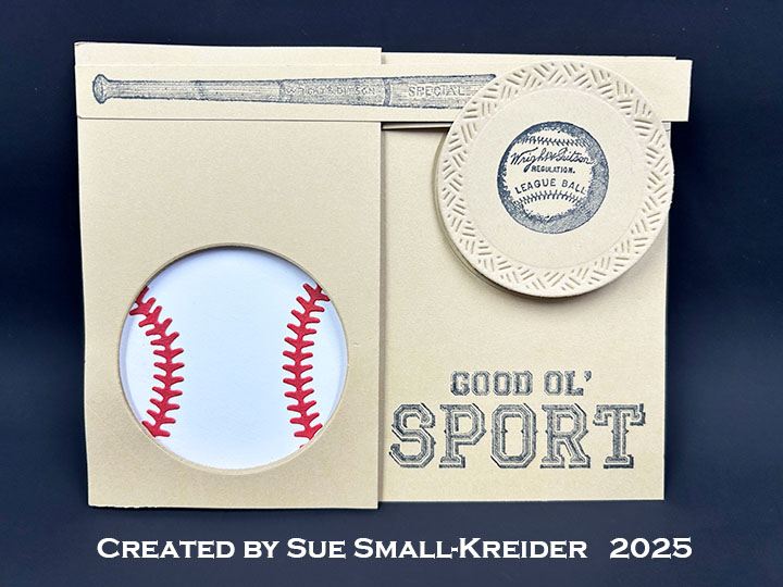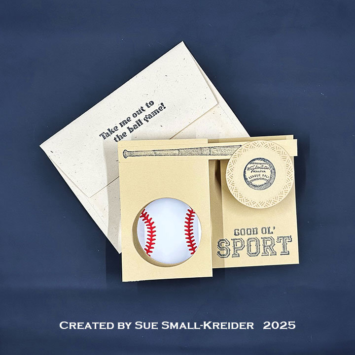 Envelope: The panel card fits into an A2 (4.25×5.5-inches) size envelope with the back flap stamped with “Take me out to the ball game!” from the Graphic 45 stamp set.