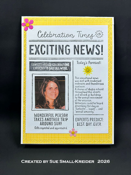 Sentiments: On the card front the newspaper Celebration Times is from the Concord & 9th Happy Headlines stamp set.I printed a generic head shot as a placeholder for the photo of the individual that the card will go to. Inside, the “Happy Birthday is from the Karen Burniston Birthday/Belated stamp set and the “Eat Cake First” is from Fun Stampers Journey’s Birthday Bash set. The white label for a personal message was cut using Karen Burniston’s Rectangles and Labels – Crosshatch die set.