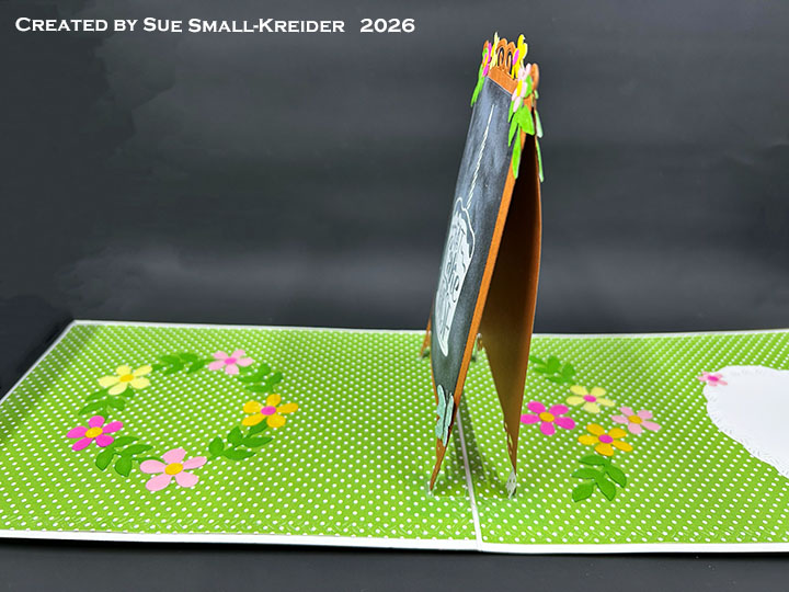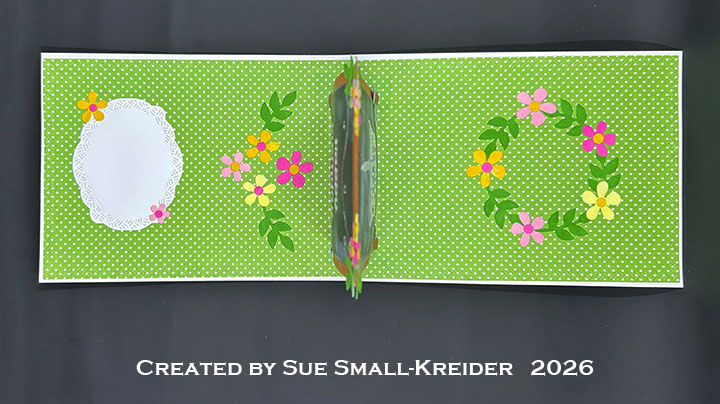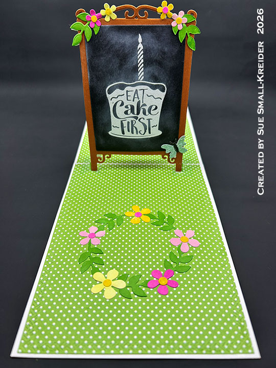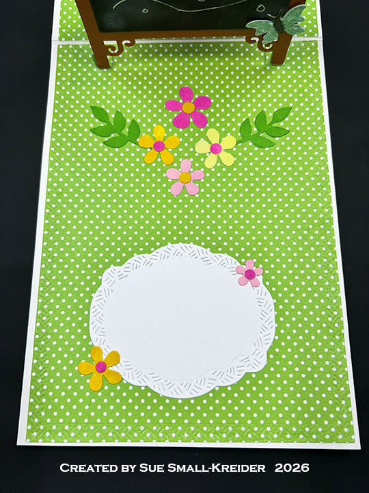 Floral Decorations: (Watch the video above.) My colored cardstock was made by swiping ink pads across white and cream scraps of cardstock. Using Karen Burniston’s Fun Flowers die set, cut out and assemble four sets of flowers in different colors. Cut nine stems of leaves.Cut and decorate two butterflies.