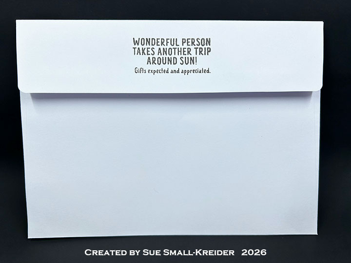 Envelope: The card fits into an A7 (5×7-inch) envelope decorated with a stamped sentiment on the back flap from Concord & 9th Happy Headlines stamp set.