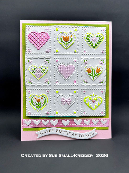Cardbase: I folded an 4.25×11 sheet of pink 100lb. cardstock in half to create a top-fold 4.25×5.5-inch card. The green mat is a marbled cardstock cut 4×4.875-inches. The embossed piece was trimmed down to 3.75x 4.25-inches and colored with markers and a gel pen. A pink ribbon is under the white hearts that were leftover from another card. (I don’t know what the die was, but it cut hearts in two sizes.)