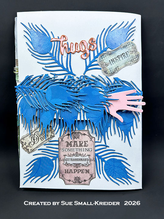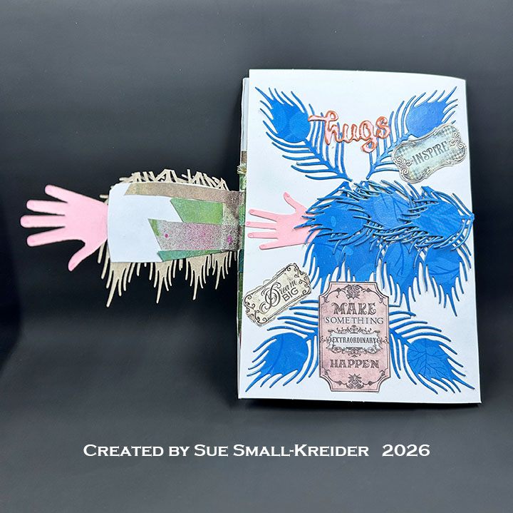 Hugging Arms: Follow the video above to see how 14 of the feathers cut using Karen Burniston’s Peacock Add-Ons die set were used with the two pink hands cut using My Favorite Thing’s Crafty Hands die set.