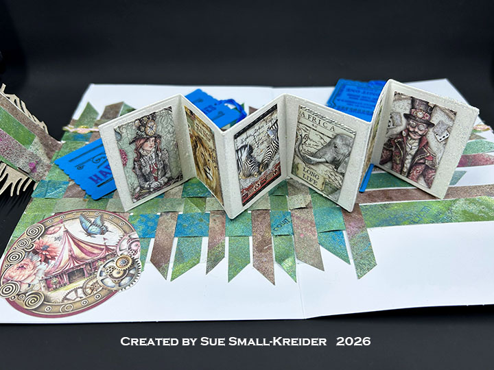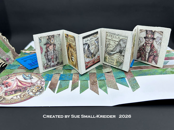 This card was made for Craft Roulette #308 whose parameters were: a card with a bookmark, circus colors, hug(s) element and feather(s)/(ing). I used dies from Karen Burniston and My Favorite Things to make this tri-fold, 5×7-inch pop-up birthday card.