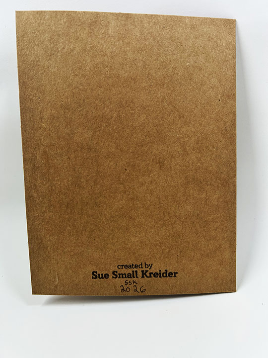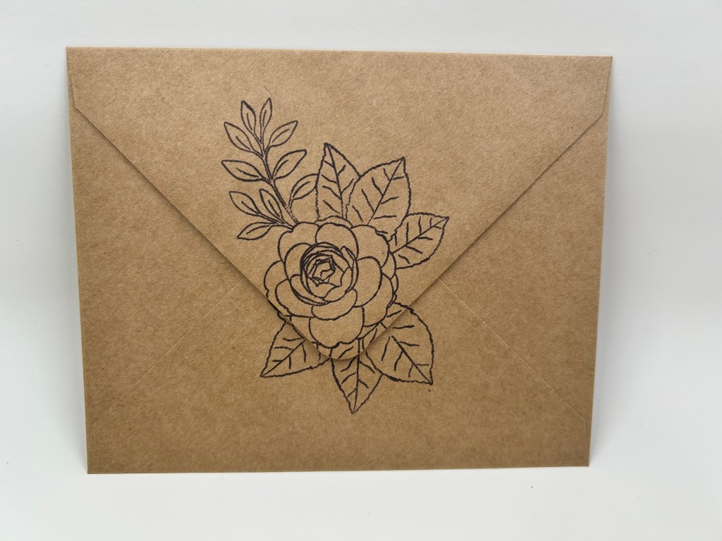 Envelope: Using a purchased A2 matching kraft paper envelope stamp the flower image on the back in brown ink.