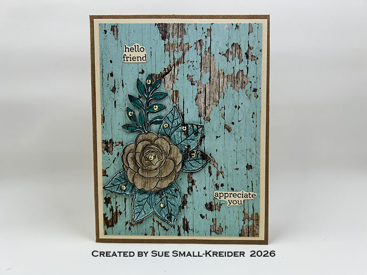 After receiving this personalized stamp set from Altenew, I had to make something with it. Card Chaos with Irene Smith! had a Bingo Challenge on with colors. I picked ivory, brown and teal colors and found a Stampin’ Up designer series paper pack called Country Woods that had those colors.