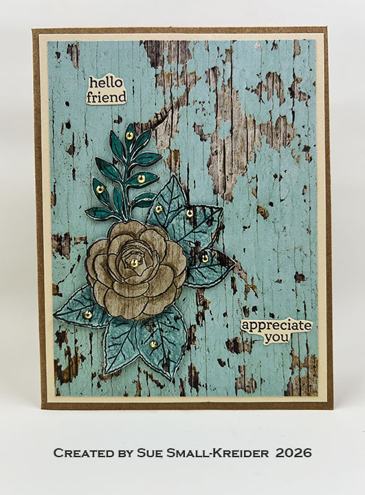 Sentiments: From the Altenew stamp set, “Hello friend” and “appreciate you” are stamped in brown ink onto ivory cardstock and fussy cut out. Glue directly to the card front. I used my custom stamp on the card back.