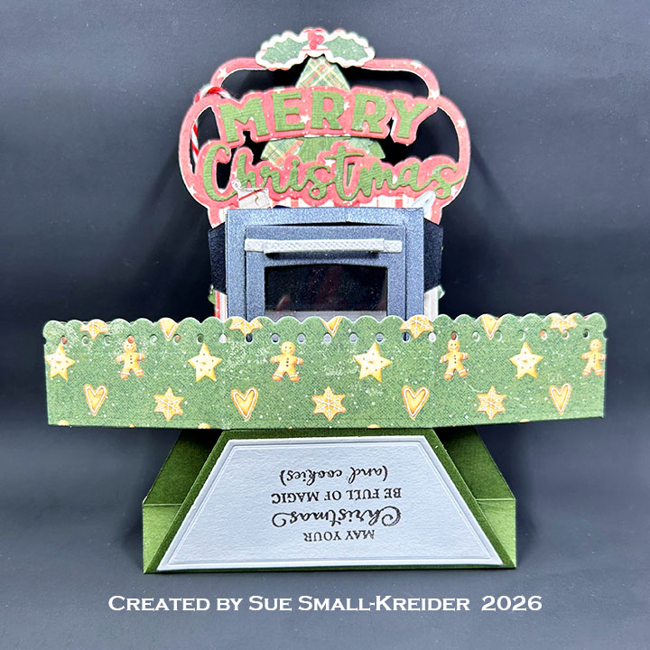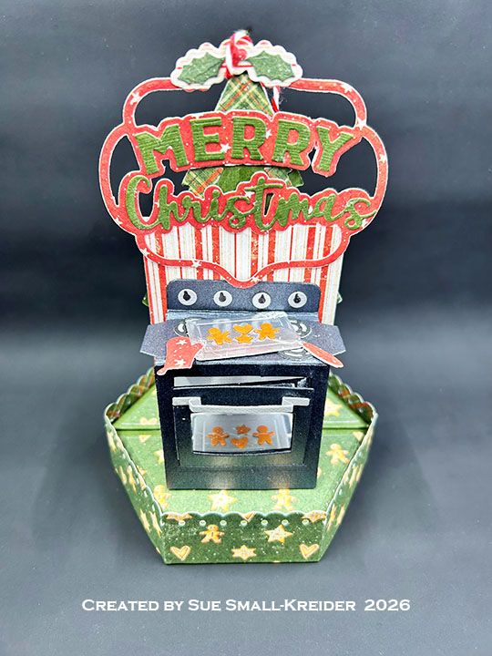 I had so much fun making a gingerbread house ornament for the Karen Burniston Design Team April 2026 Challenge using the Stage Pop-Up die set, that I made another ornament card with a baking theme. To the Stage Pop-Up I added the Oven Pop-Up along with the Christmas Trees Pop Stand, the Merry Christmas Lorna Add-Ons and the Party Stage Add-Ons.
