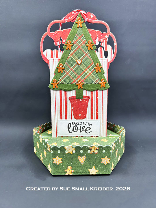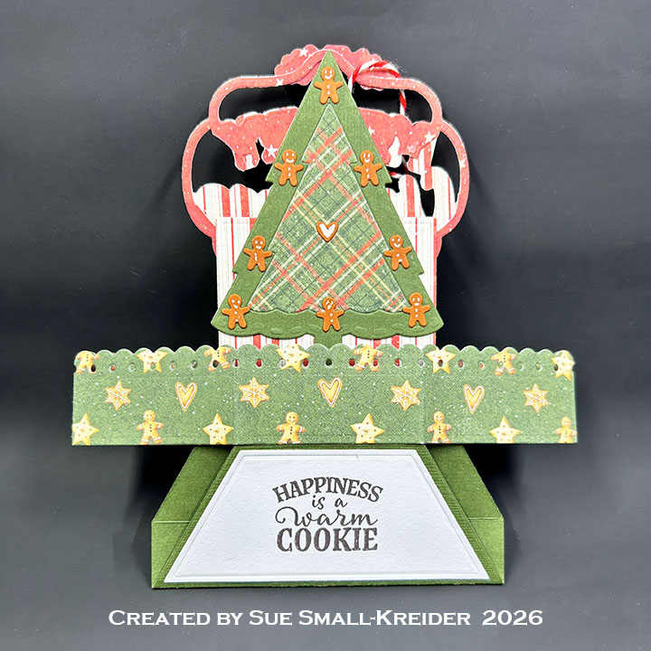 Sentiments: The tree sentiment “Baked with love” is from the Sweet Treats stamp set and stamped on the white rectangle decorator piece with brown ink. The bottom stamped sentiments come from Christmas Wishes and Sweet Treats stamp sets. “Merry Christmas” is die cut using the Merry Christmas Lorna Add-Ons with the base piece cut twice from red decorative paper and the letters cut once from green cardstock. (Watch the video above to see how the die-cut sentiment is installed. For an assembly video of the Lorna Add-ons click here and watch video at the bottom of the linked page.)