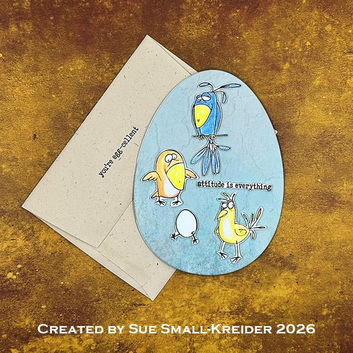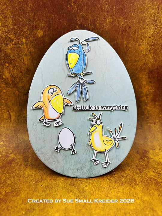 I like discovering new craft companies by perusing the Spin Sponsor section of Craft Roulette. That’s how I found this amusing stamp set of snarky birds from The Rabbit Hole Designs. I pared it with a nested egg shaped die set from Simon Says Stamp!