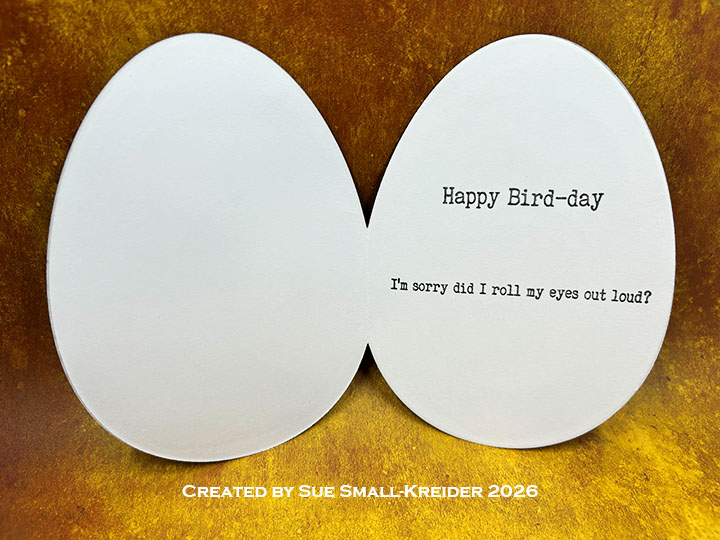 Sentiments: From The Rabbit Hole Designs stamp set, “Happy Bird-day” and “I’m sorry did I roll my eyes out loud?” are stamped in black ink onto the inside of the cardbase. (I find it easier to do this stamping before finishing the outside of the card.)