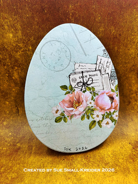 Cardbase: I used a 65lb sheet of white cardstock folded in half and die-cut the largest egg in the Simon Says Stamp Basic Shapes Nested Eggs die set. The die was placed with fold on the left side and the left edge of the die was slightly over the fold. I cut two eggs from decorative paper to cover the front and back of the card, gluing the back on first, trimming off the edge that extended over the fold before gluing the front egg onto the cardbase. (I stamped my inside sentiments before gluing the outside pieces onto the cardbase.)