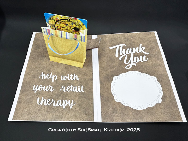 This card was made for CRAFT ROULETTE #278 whose parameters included a thank you card, bakery colors, shop (s) (ing) element, and ombre. I chose to make a a pop-up gift bag card that holds gift card using Karen Burniston dies.
