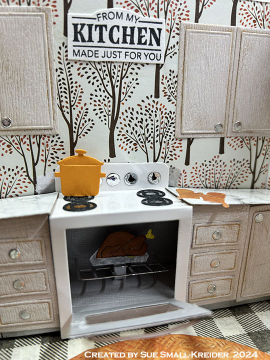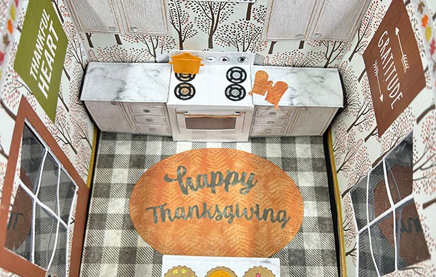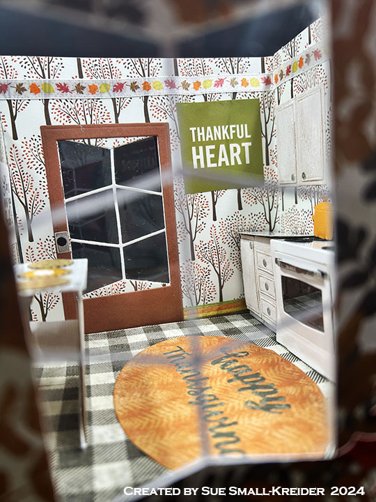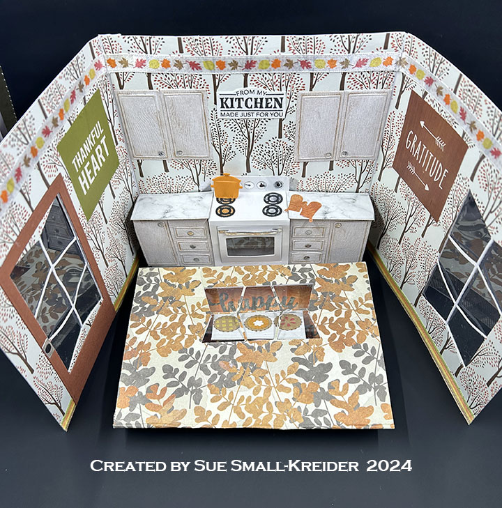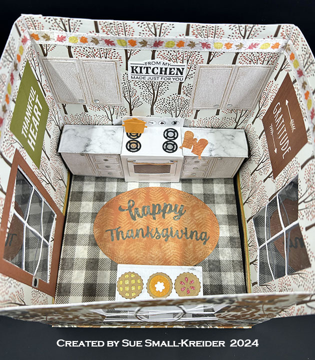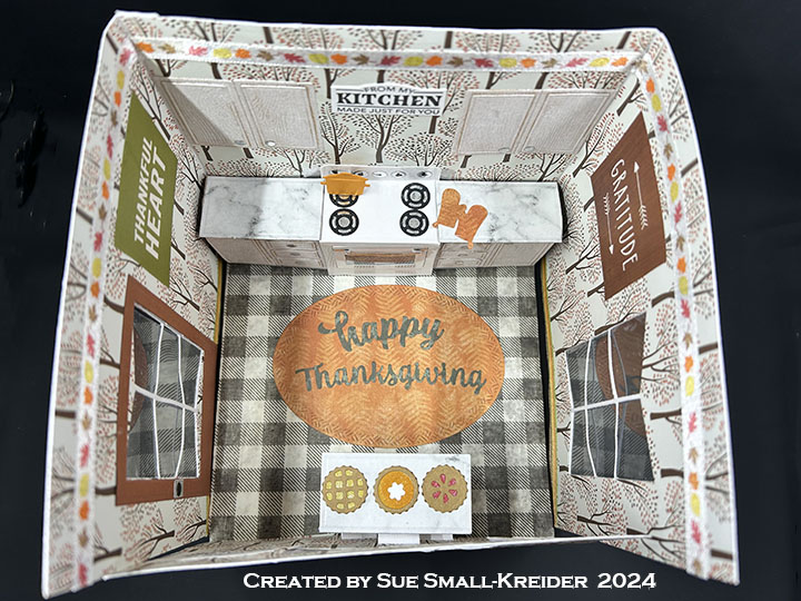 Sentiments: The inside stamped sentiments are from the Fall Phrases set. The die cut “Happy Thanksgiving” is cut from orange pattern paper using the Word Set 7 – Autumn set. From white cardstock, cut two medium sized labels from the Labels – Crosshatch, the center label and three banners from the Little Labels Pop-Up set to stamp. Adhere the largest two labels as places to write a personal message.