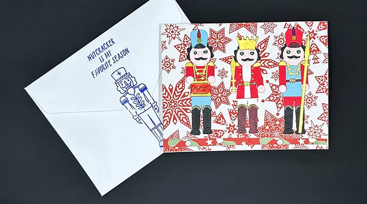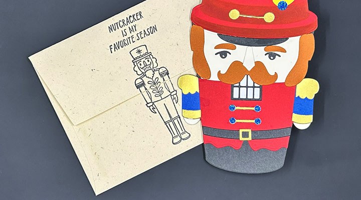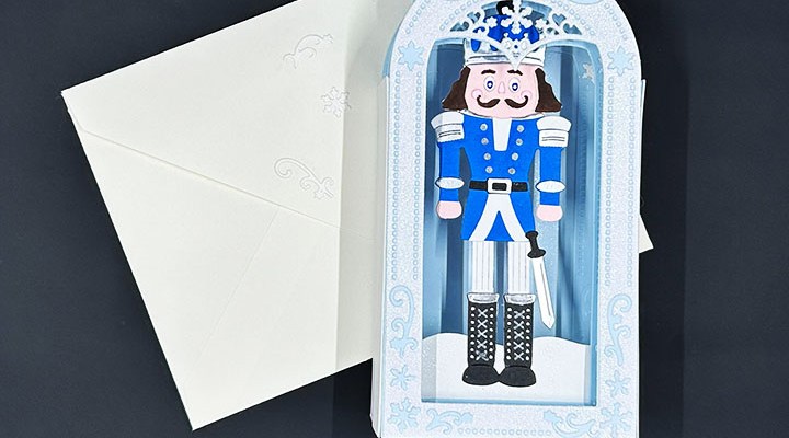 Nutcracker: Referring to the images of the nutcrackers on the packaging for the Nutcracker die set and the video above, cut out all the pieces using your own color scheme. (I cut out the entire body from flesh colored cardstock and then dressed the nutcracker.) The nutcracker is glued into the second layer of the tunnel card at the hat (onto the lattice work of the frame) and at the boots onto the snow piece. (The snow piece is glued to the back side of the frame. )